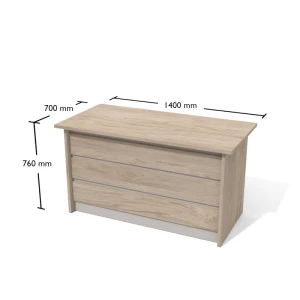 Blat i nogi z płyty o grubości 25 mm, osłona 18 mm wraz z boniowaniem 18 mm, regulacja wysokości na stopce ok 12 mm.