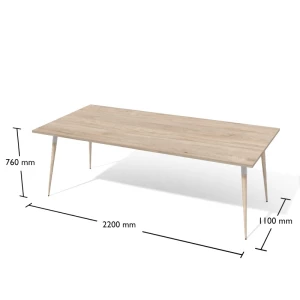 Stelaż stołu tworzy stalowy profil lakierowany proszkowo z toczonymi, stożkowymi nogami z naturalnego drewna bukowego pokrytego metodą olejowania (olej przezroczysty matowy).